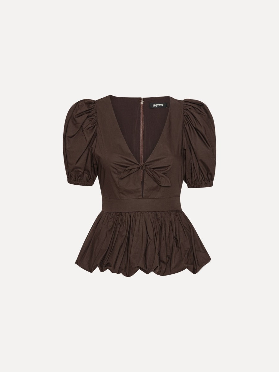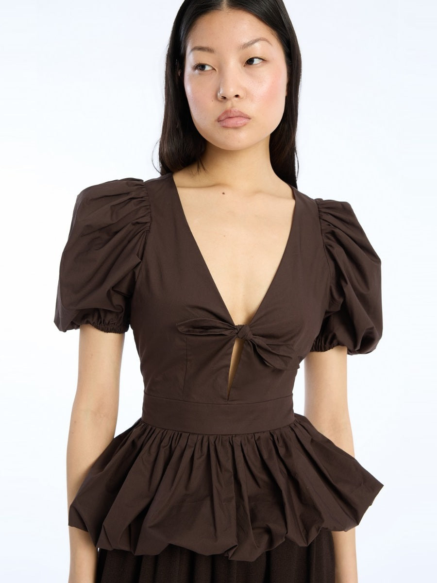 Puff Sleeve Bubble Top Dark Brown is crafted from organic cotton with a soft lining in viscose and elastane. The design features short puff sleeves with gathered details, a deep V-neckline with a front tie detail, and a fitted waist. The voluminous bubble hem creates a peplum-like silhouette. The top is lined.