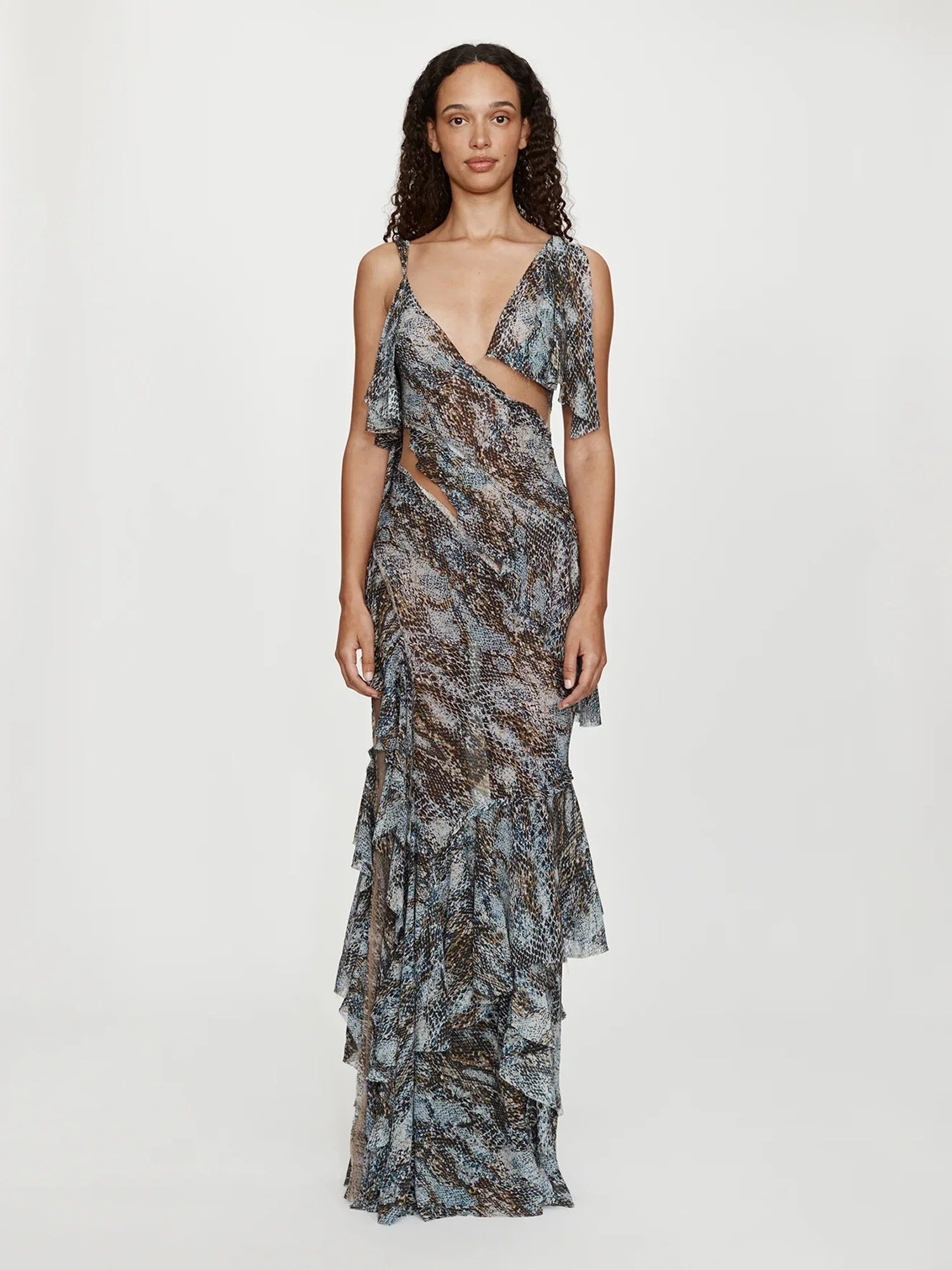 The Unravelled Serpent Cami Dress is crafted from silk printed with serpentine motifs, evoking movement and fluidity. Asymmetric cutouts trace the body, while cascading ruffles fall through the skirt, creating layered dimension and softness.
