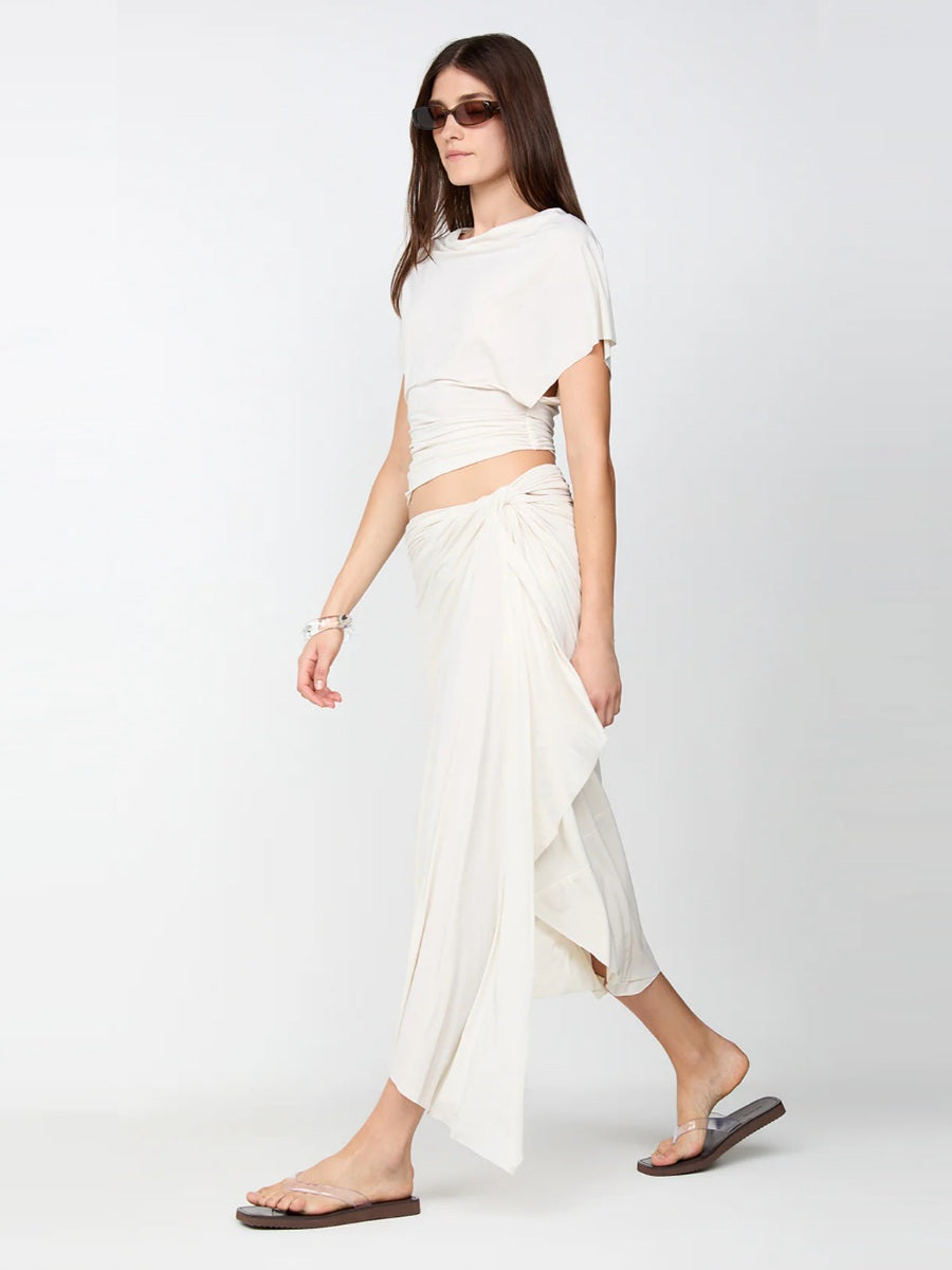This chic jersey skirt, with its flattering draped silhouette and unique side twist detail, is perfect for a stylish night out or elevated holiday styling.