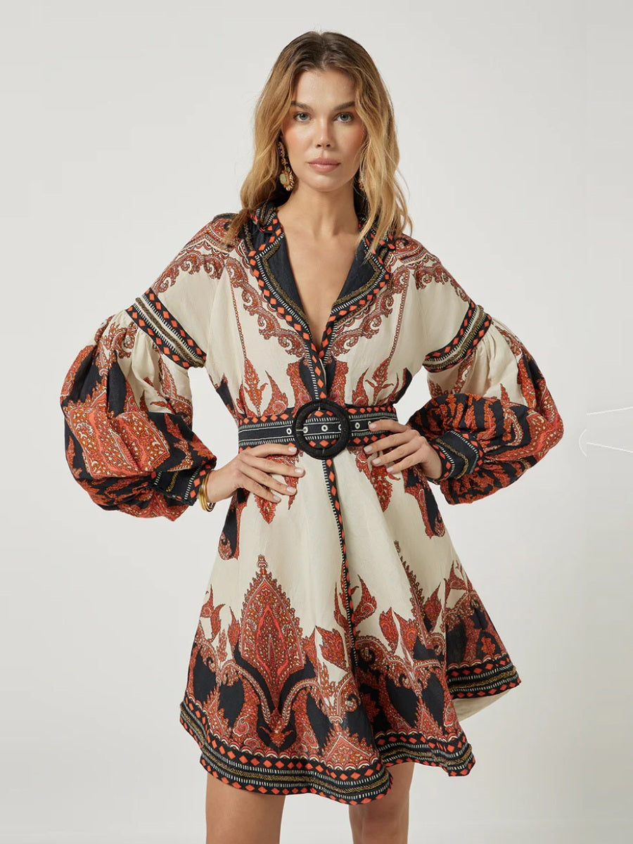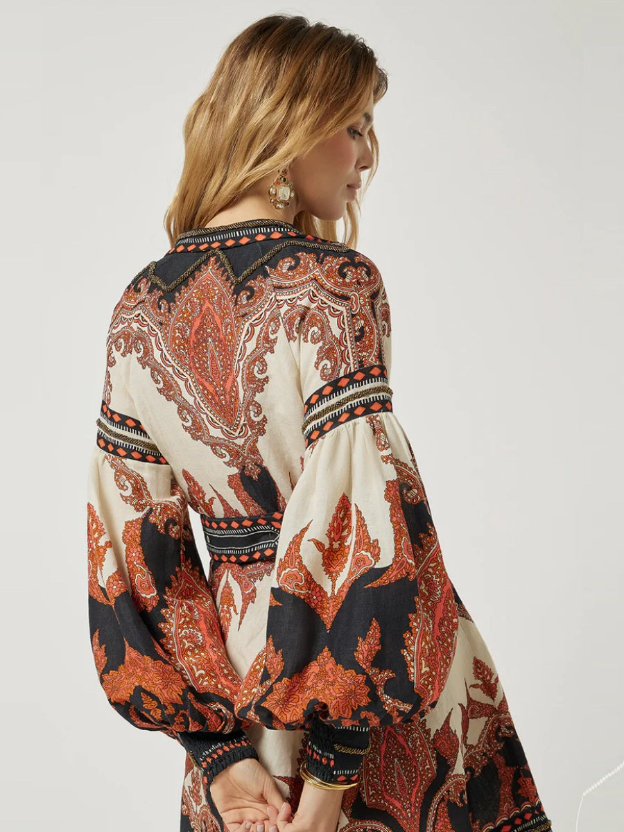 Discover the allure of the FLORISTA SHORT DRESS, a charming short length piece crafted from a luxurious Linen-Viscose blend. With a fitted waist and classic lapel collar, it features a full open front with an engineered placement paisley print.