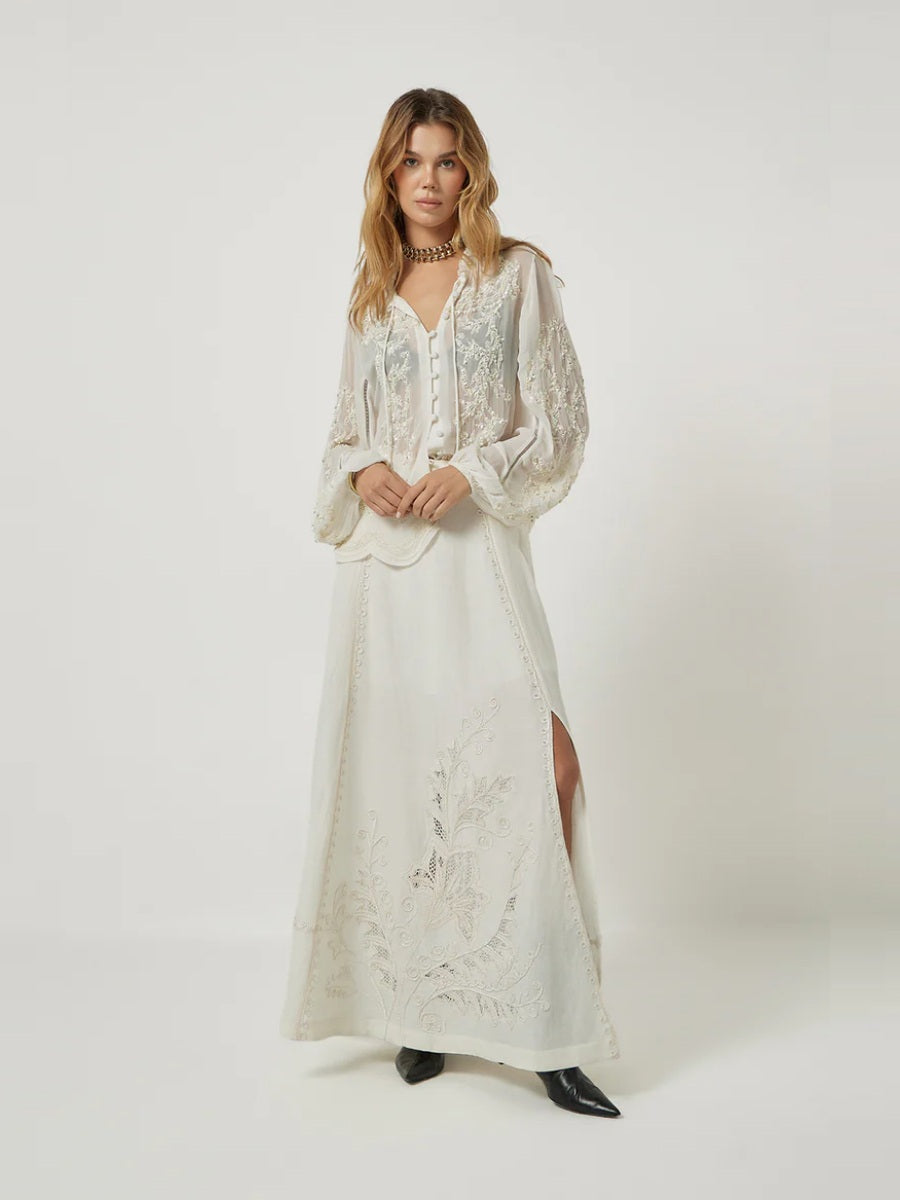 The MARYLENE SKIRT is born to be a forever favorite. Handcrafted from a linen viscose blend, it has a stunning tone on tone mesh applique embroidery framed with tape embroidery motifs deco.