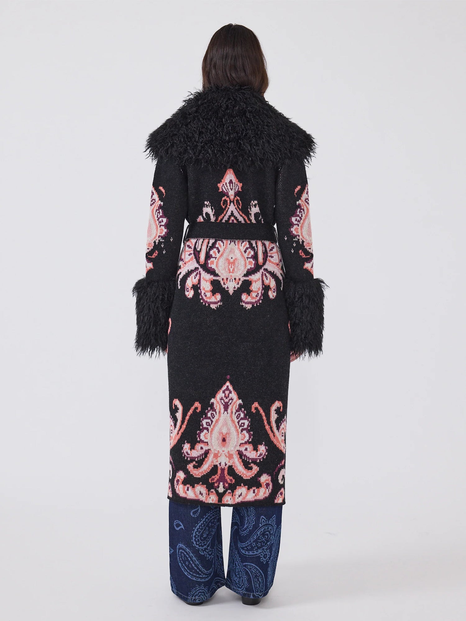 70s nostalgia meets cold-weather drama - the Afghan coat gets a modern remix in rich black merino wool. This full-length statement coat features our hand-painted paisley, translated into a jacquard-woven knitwear story. Finished with a plush faux fur collar and cuffs
