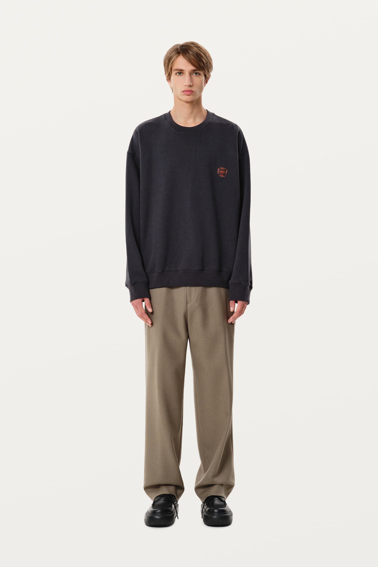 Sweatshirt. Solid gradient doodle embroidery logo detail. Leather waffle detail.