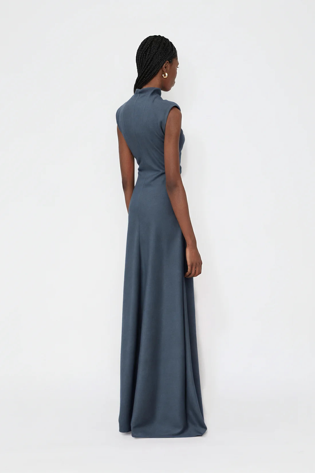 The Genis Dress, a sleeveless gathered front dress, offers refined draping and a sleek silhouette.
