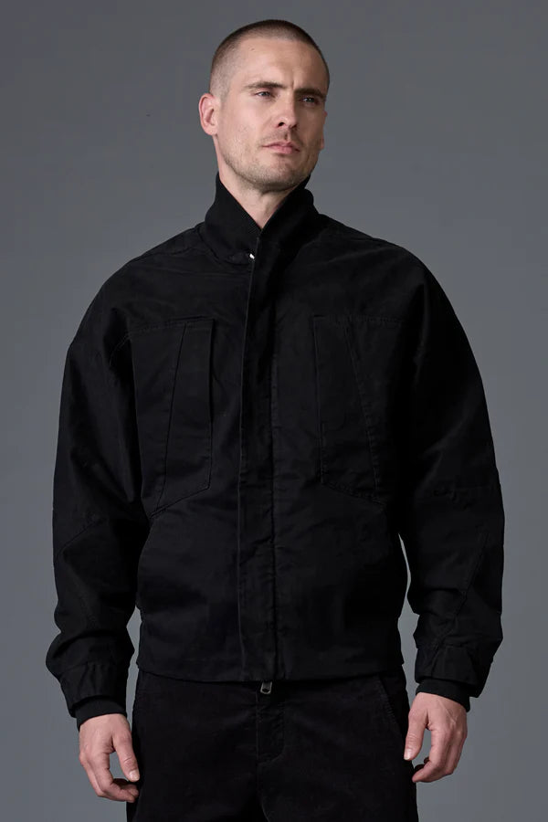 Loose fit zipped bomber in compact stretch cotton gabardine with ribbed cotton knit inserts