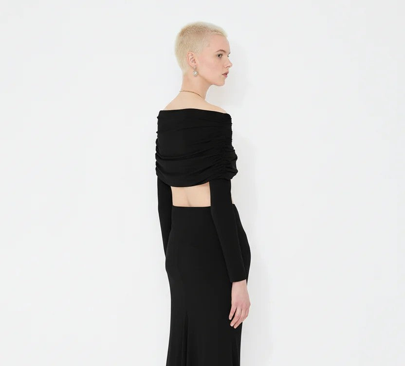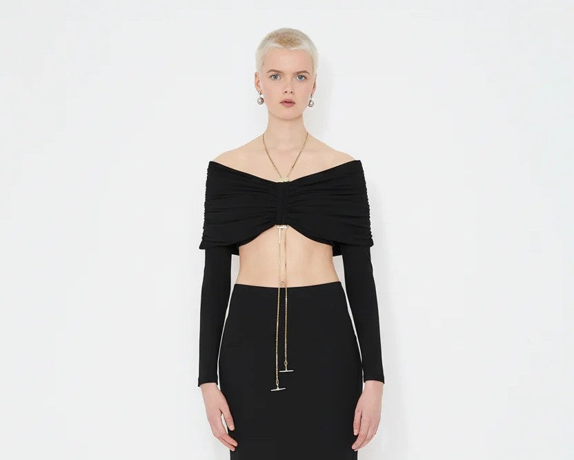 The Karen Top, a bare shoulders opaque jersey top, blends sensuality with refined minimalism.