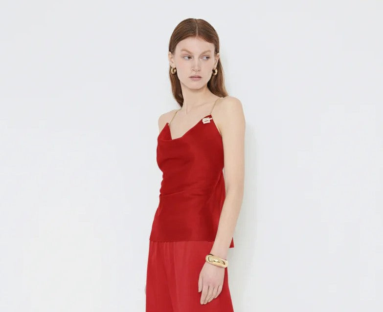 The Lou Top, a chain straps satin acetate tank top, combines fluid fabric with bold details.